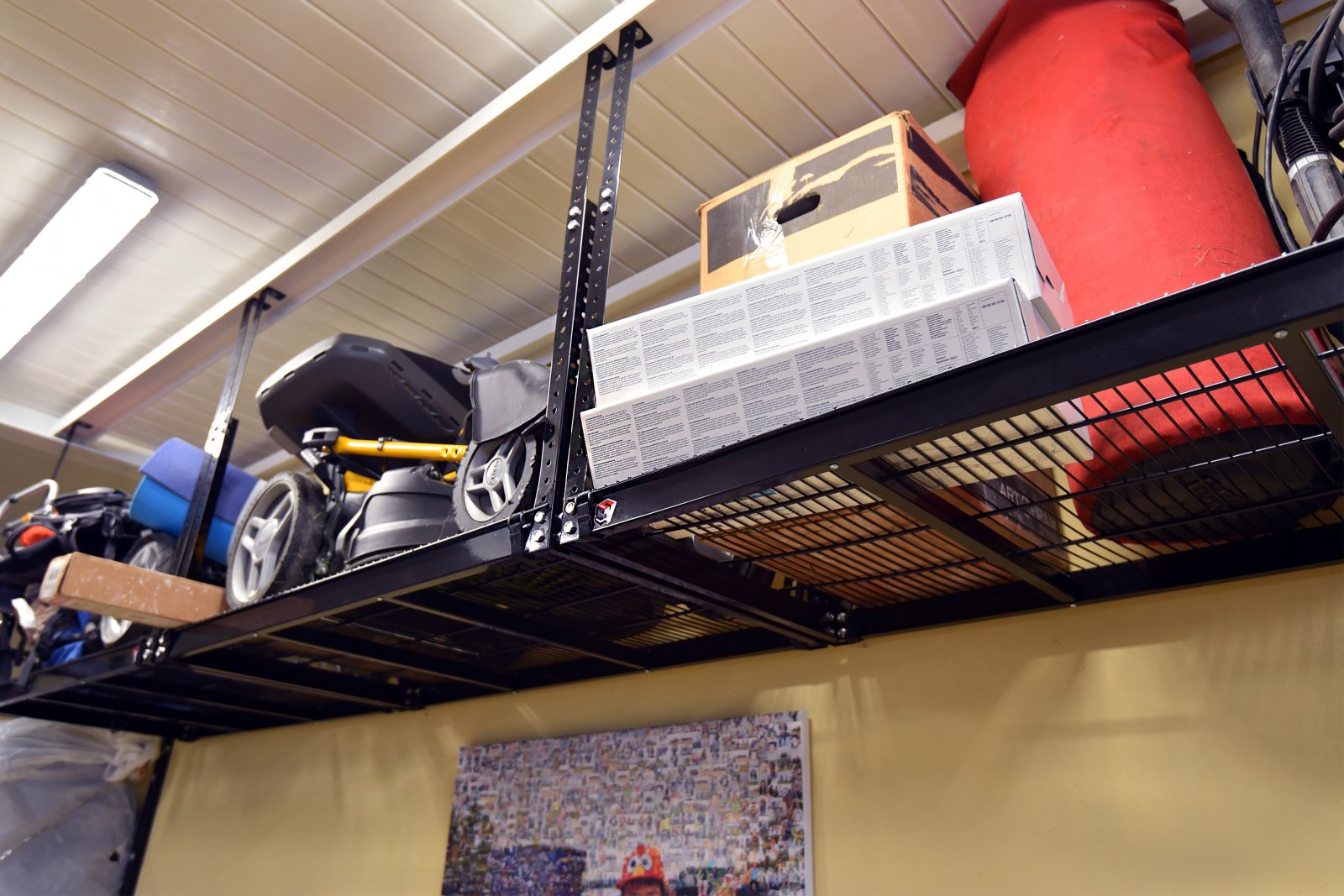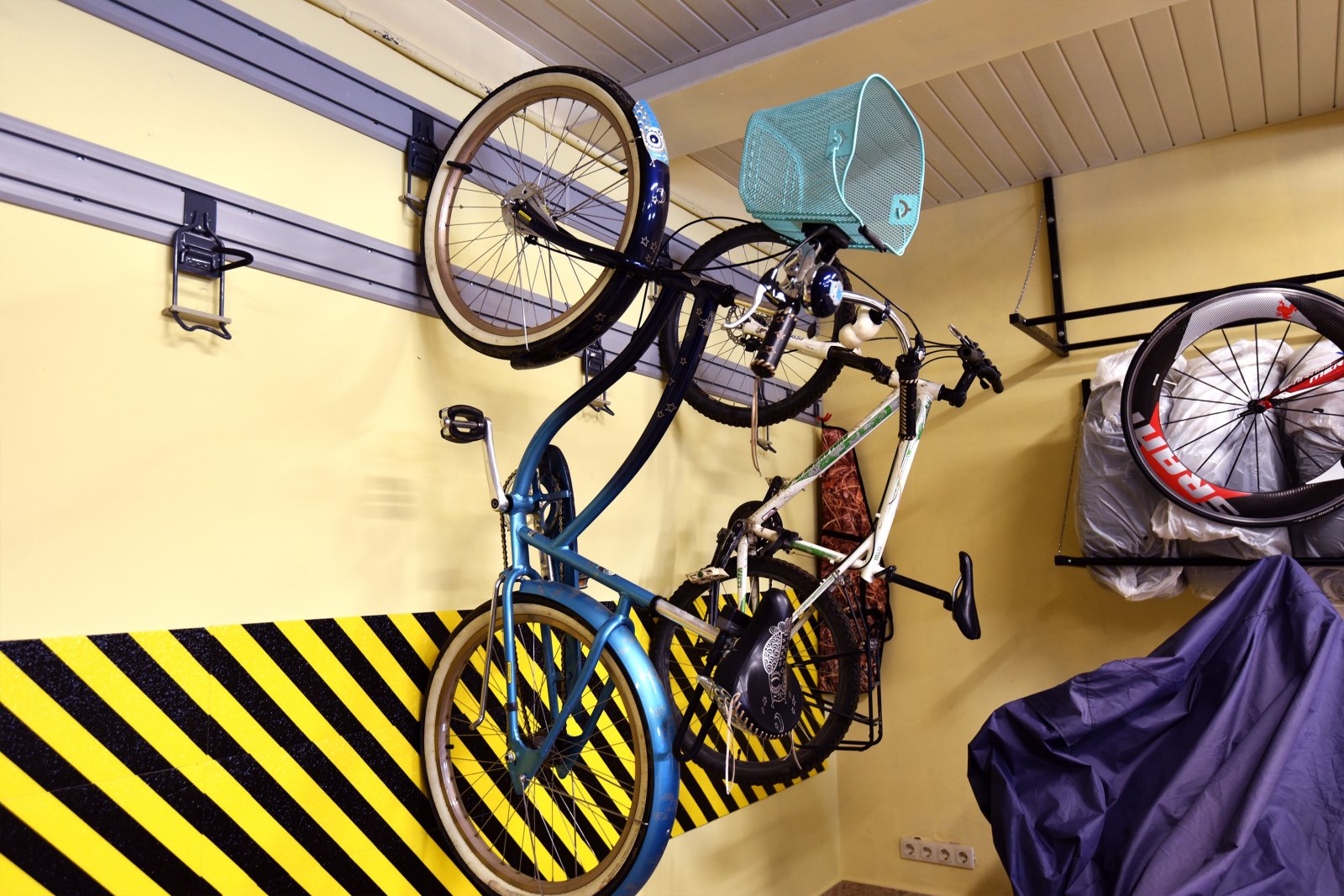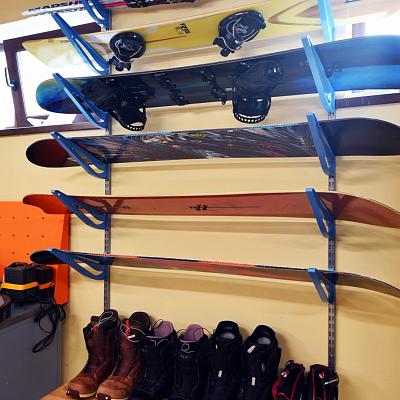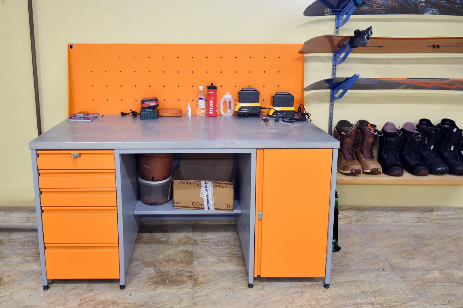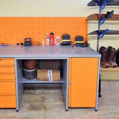 - Основой рабочего пространства стал верстак с перфорированной панелью, который объединяет рабочую поверхность и систему размещения инструментов. Перфорация позволяет гибко менять конфигурацию хранения и держать всё необходимое под рукой, не перегружая пространство