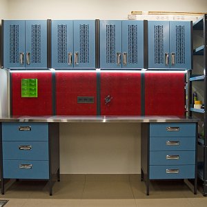 - Нижние шкафы с выдвижными ящиками - удобное размещение ручного инструмента и рабочих принадлежностей.