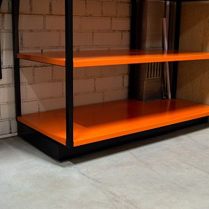 - Стеллаж сложной формы с отступами у полок - изготовлен под габариты вентиляционного короба, что позволило эффективно обойти угол помещения и использовать пространство без потерь.