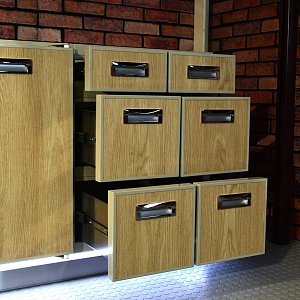 - Секция с полкой и выдвижными ящиками для крупной утвари.