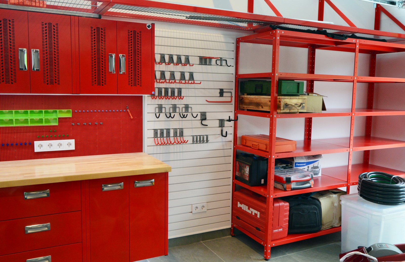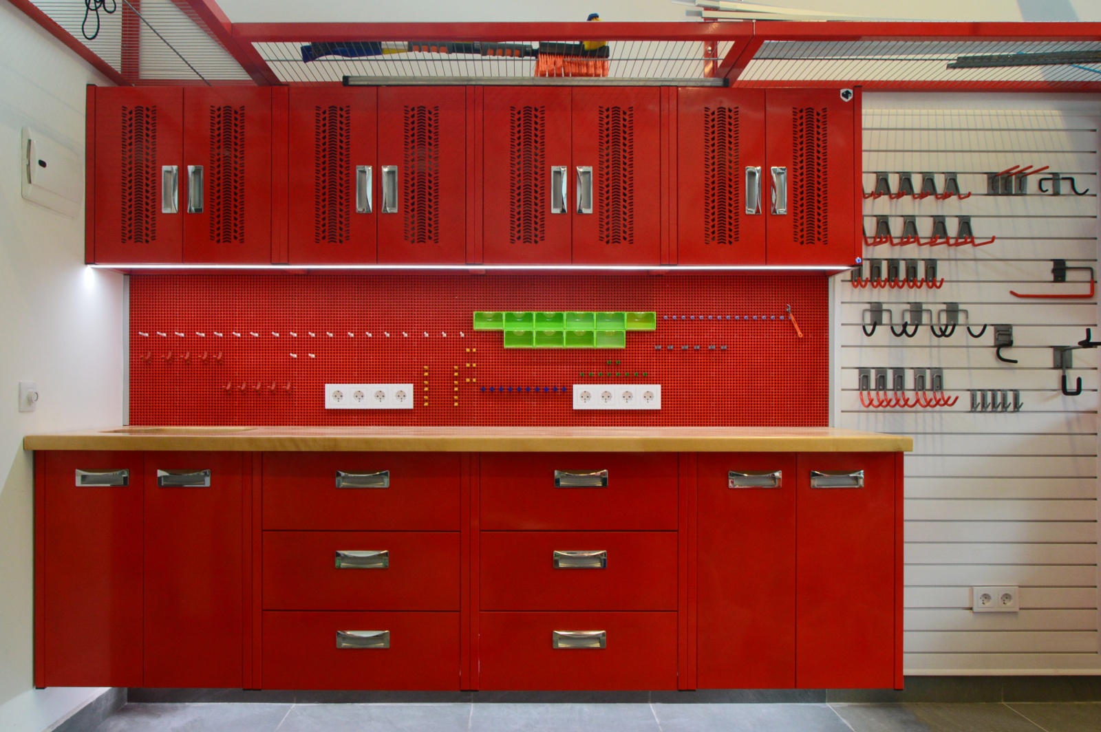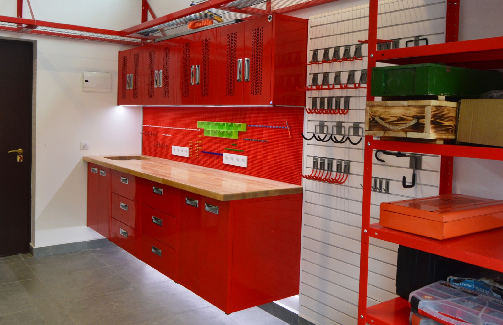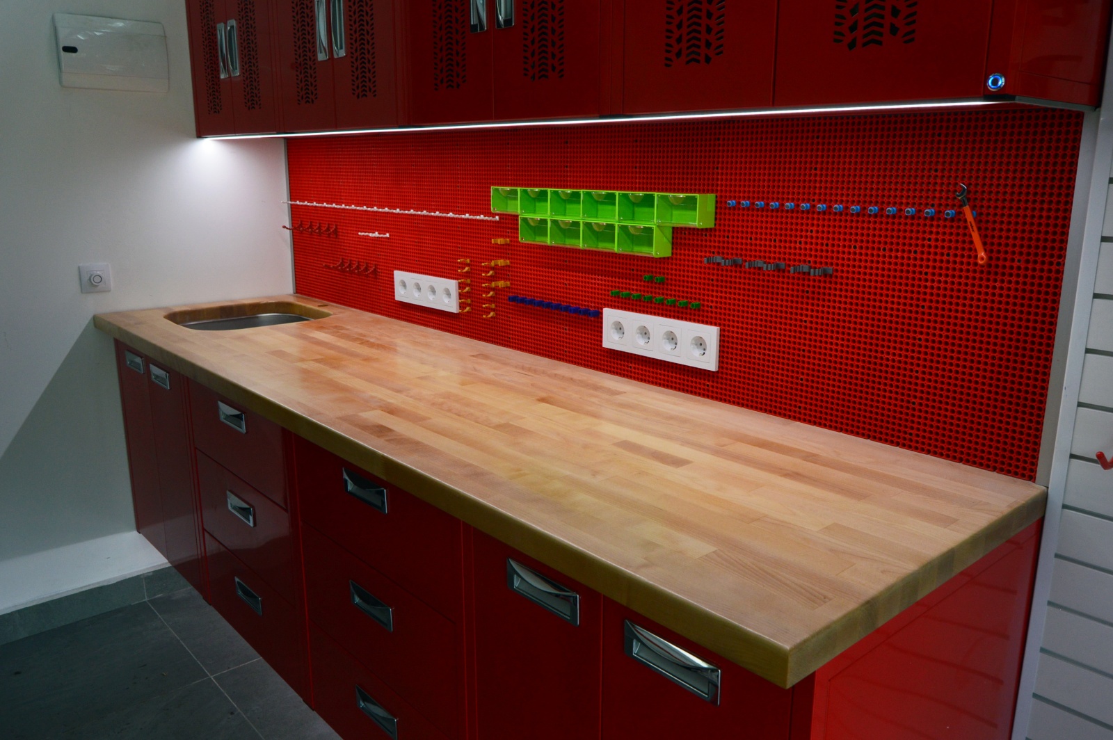 - Верстак со столешницей из дерева — отличный вариант для тех, кто заботится о сохранности нержавеющей столешницы
