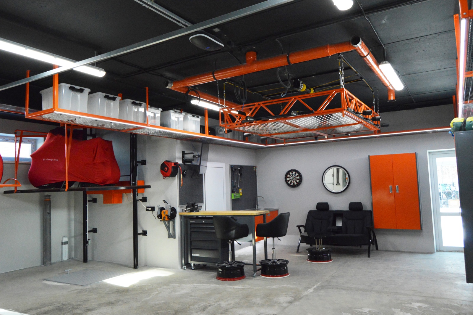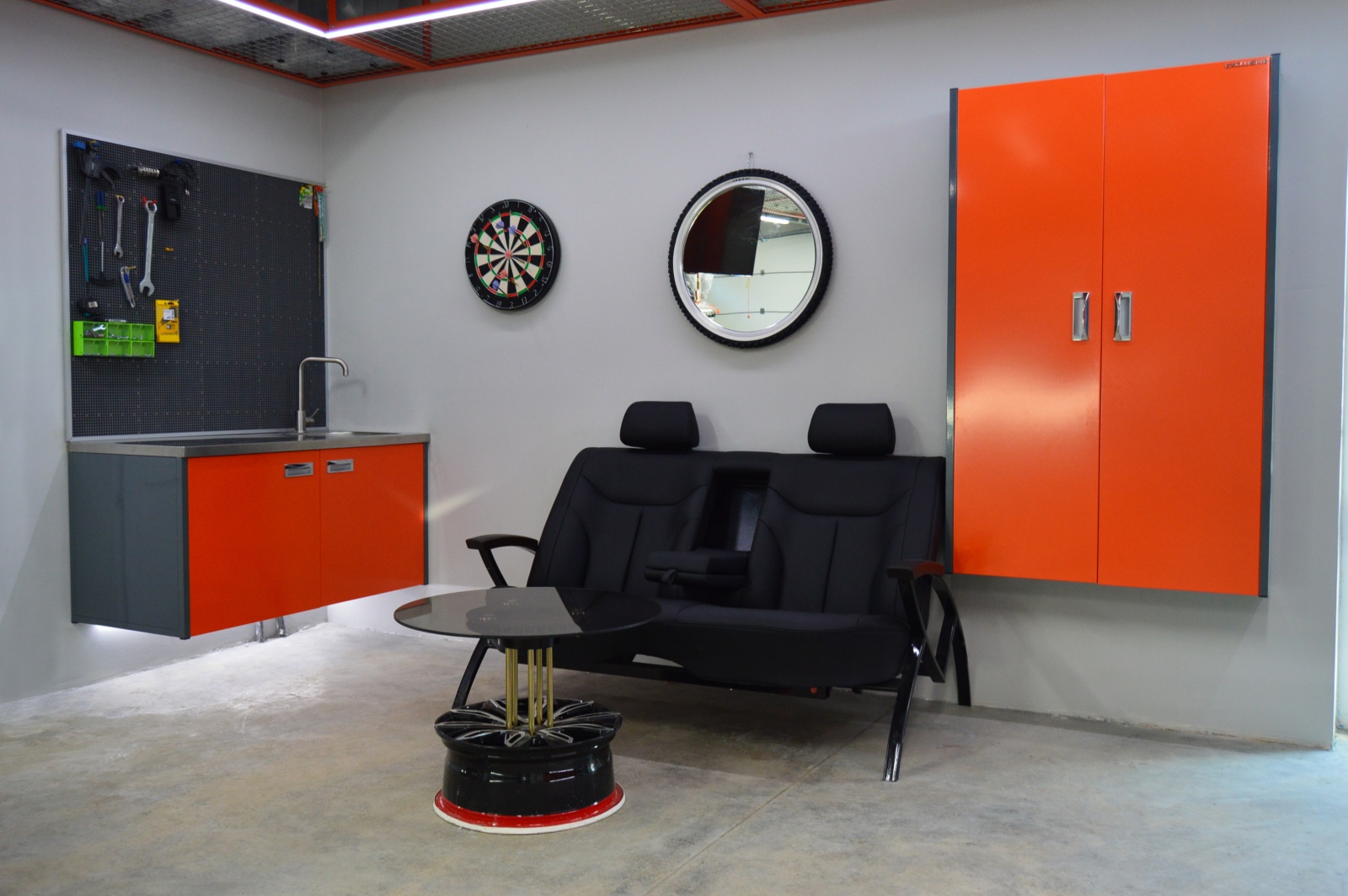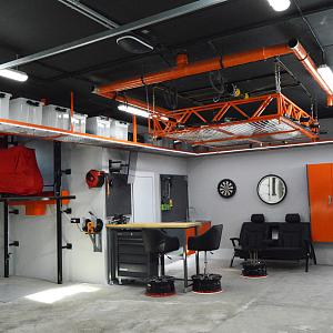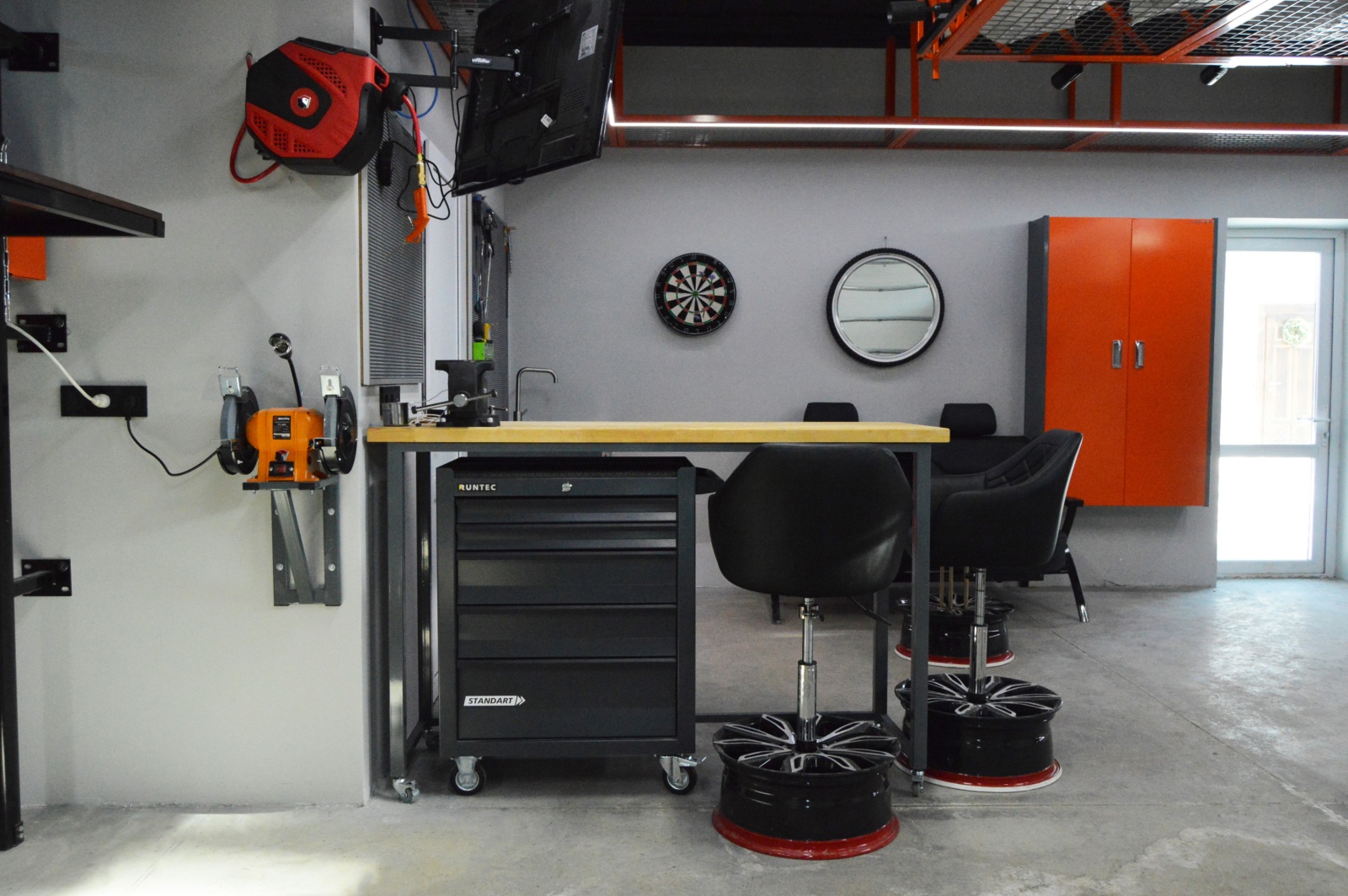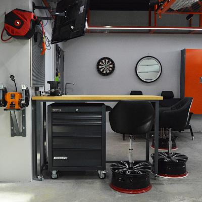 - В гараже предусмотрена удобная рабочая зона для обслуживания техники и бытовых задач. Стол-верстак на колёсиках можно легко перемещать по помещению и использовать там, где это необходимо