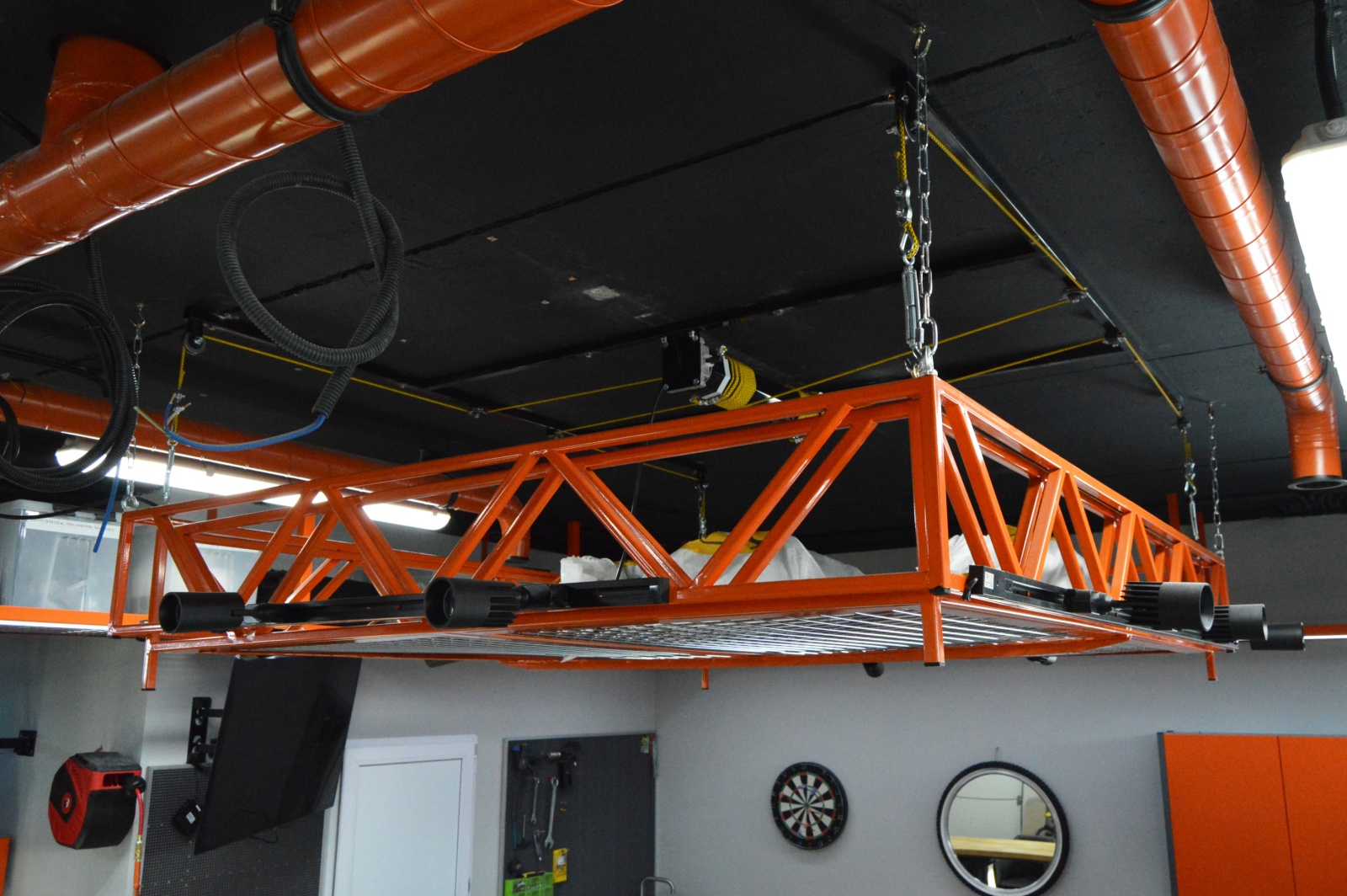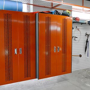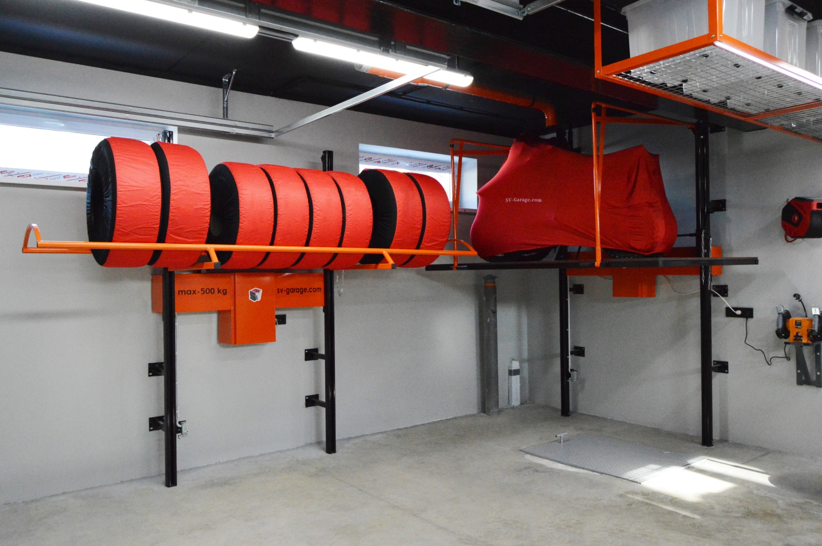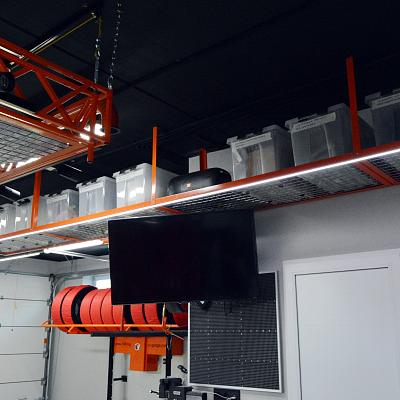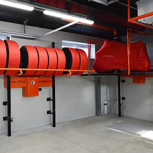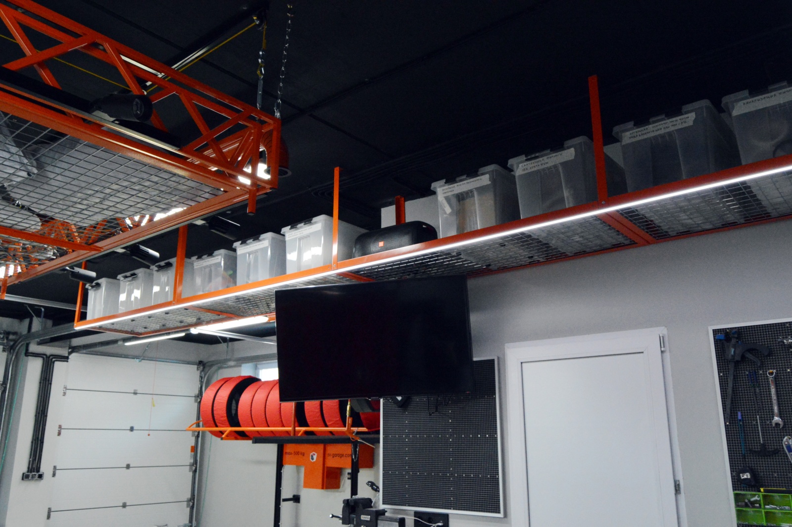 - В гараже предусмотрена удобная рабочая зона для обслуживания техники и бытовых задач. Стол-верстак на колёсиках можно легко перемещать по помещению и использовать там, где это необходимо