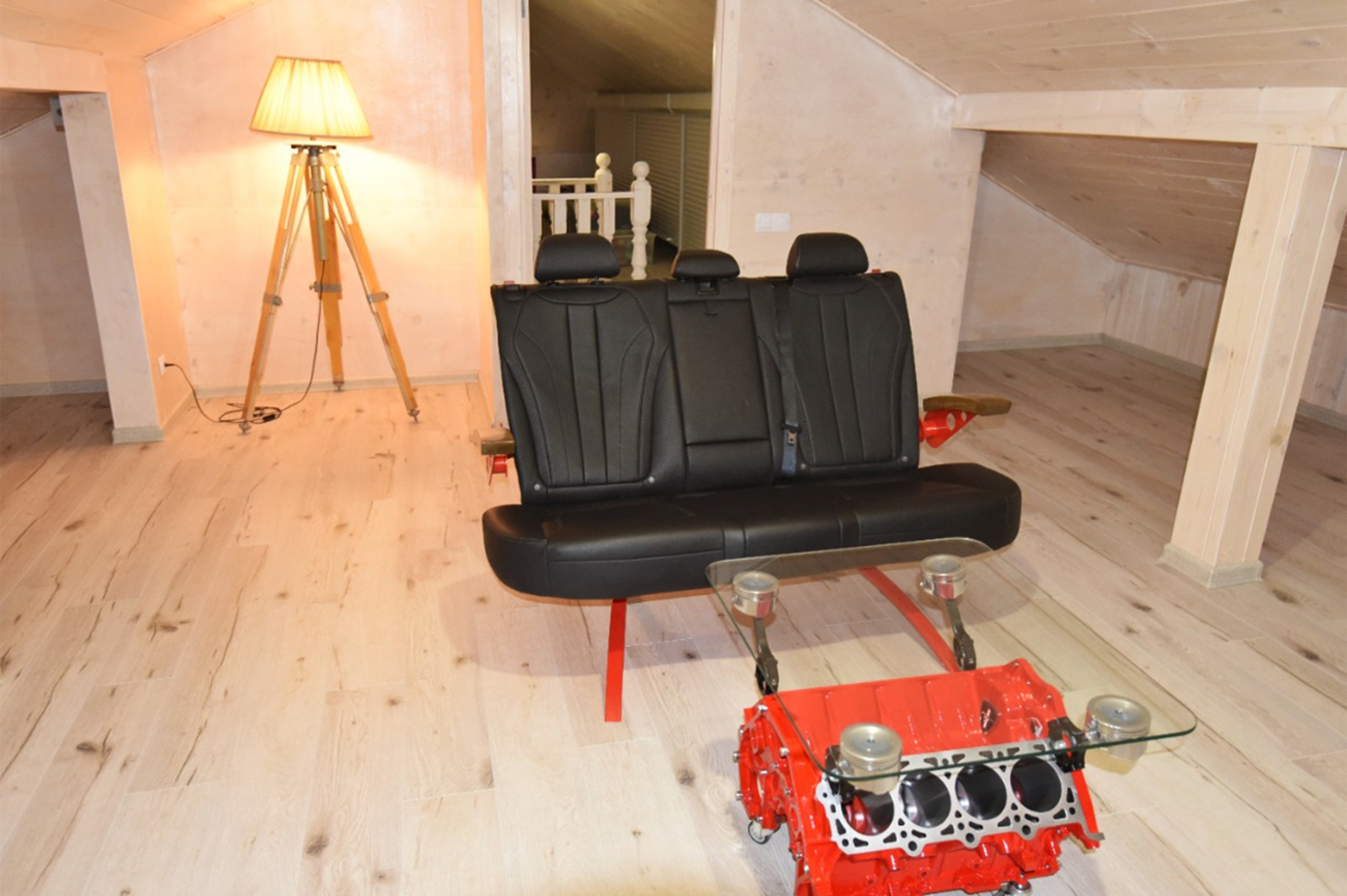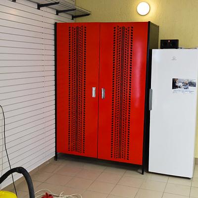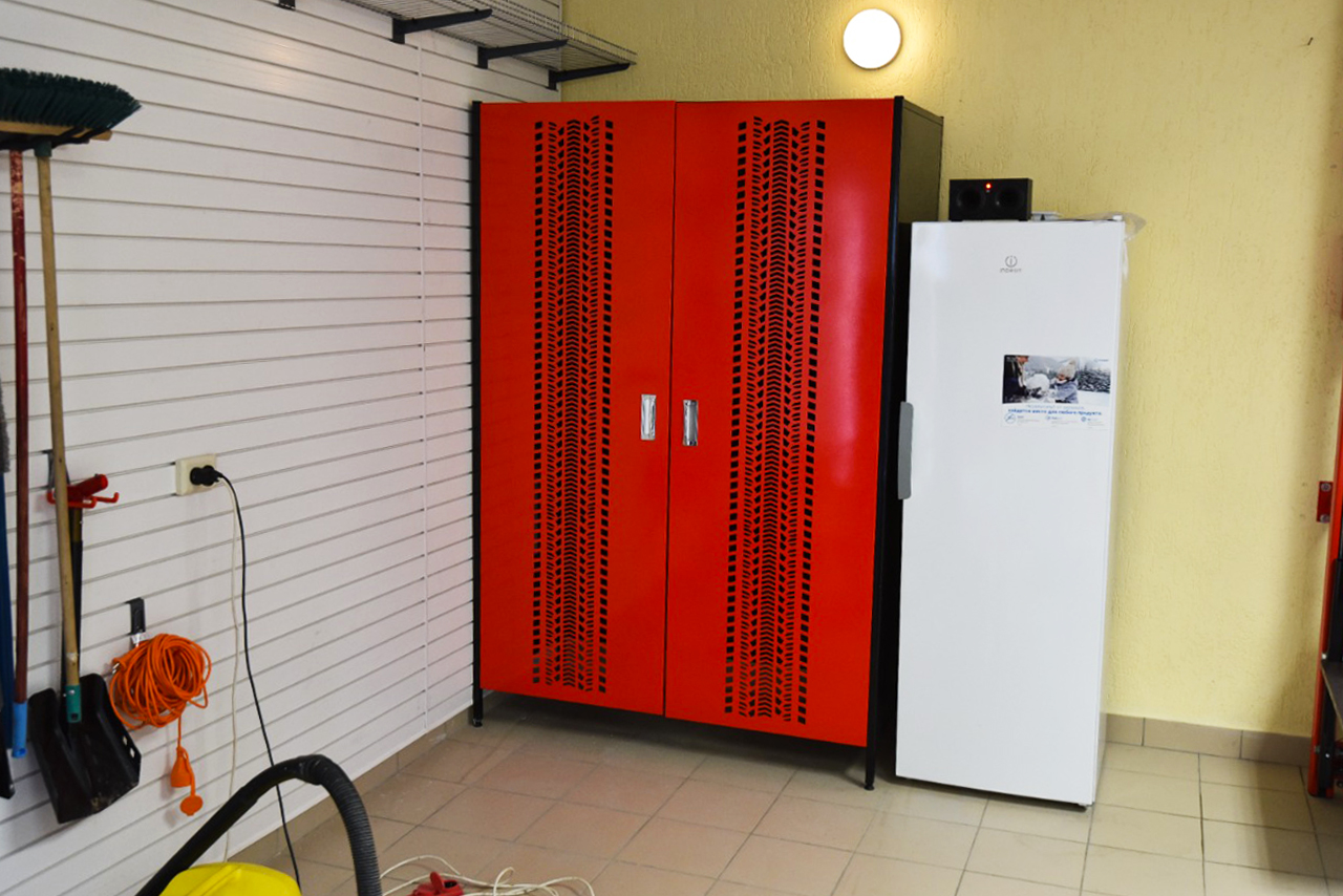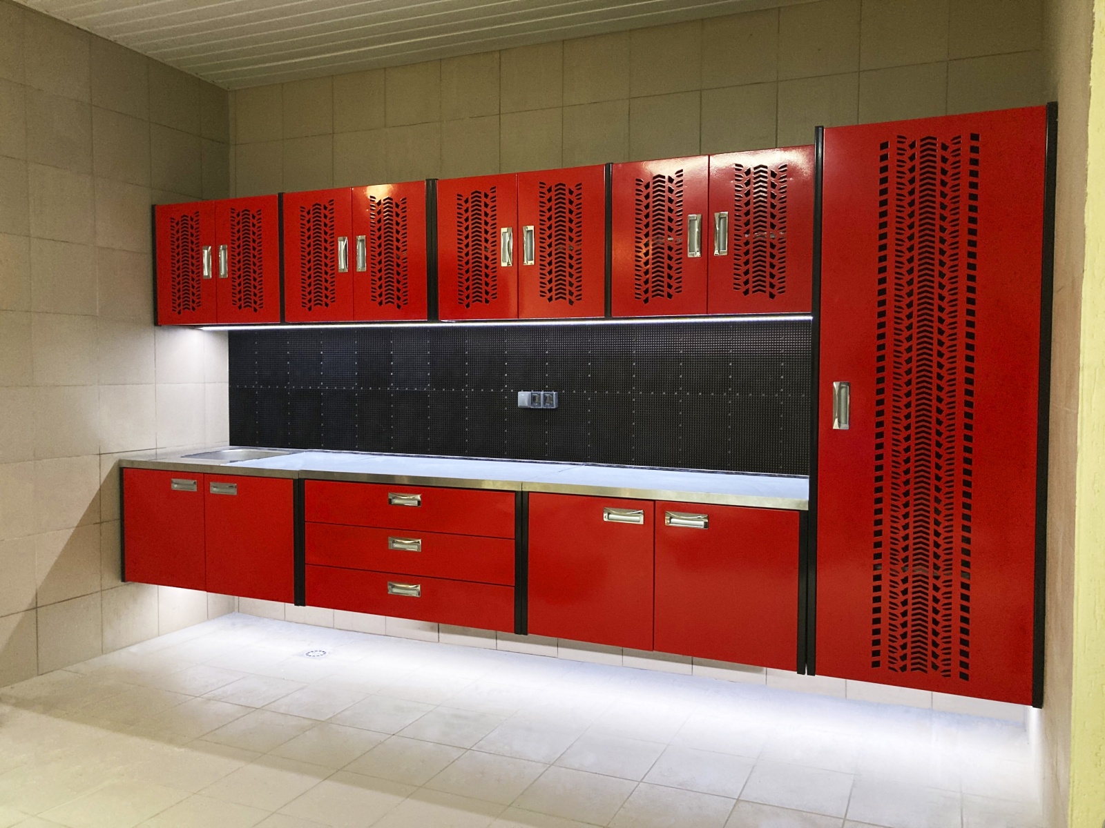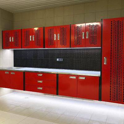 - Основой является подвесной верстак, изготовленный точно по размерам стены, на которую он монтируется. Такое решение позволяет максимально эффективно использовать пространство и создать цельную рабочую линию без зазоров и лишних элементов. Верстак обеспечивает удобную поверхность для выполнения различных задач и органично вписывается в общий интерьер гаража